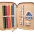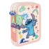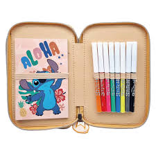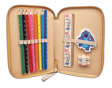 Estojo completo para Triplo do Stitch. Estojo escolar de dois andares totalmente equipado. Inclui bloco de notas de 15 páginas (tamanho post-it), régua, afiador de lápis, borracha, 8 marcadores de cor e 8 lápis de cor.