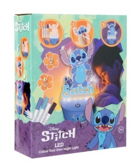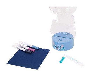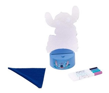 O kit inclui um suporte com luz de LED, a figura do Stitch, 4 marcadores e 1 tecido.
