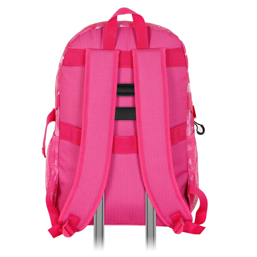 Alças acolchoadas ajustáveis, dois bolsos laterais em rede e alça traseira adaptável a rodinhas