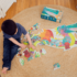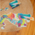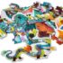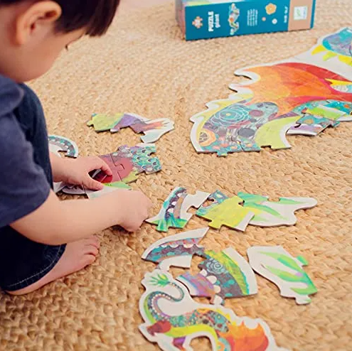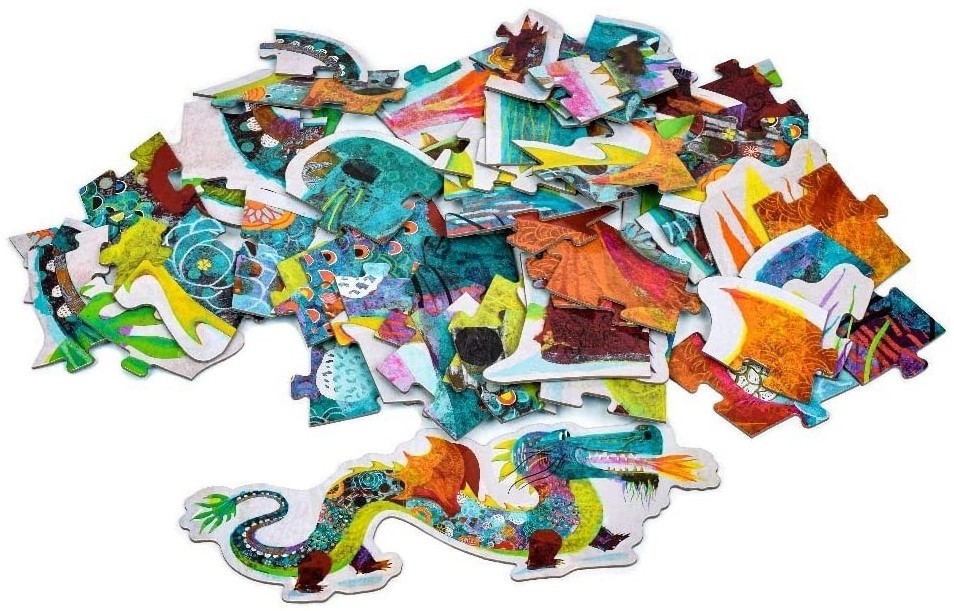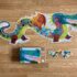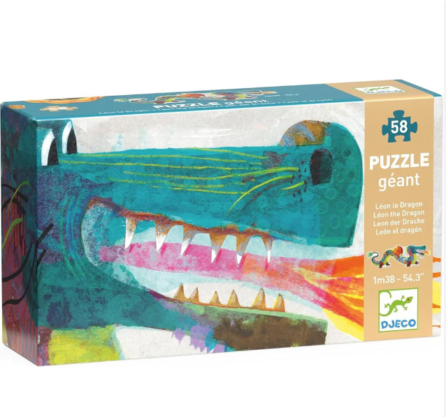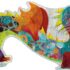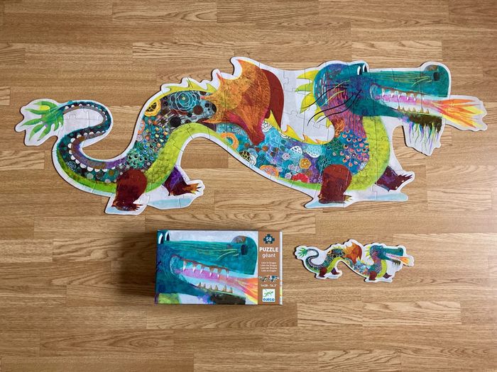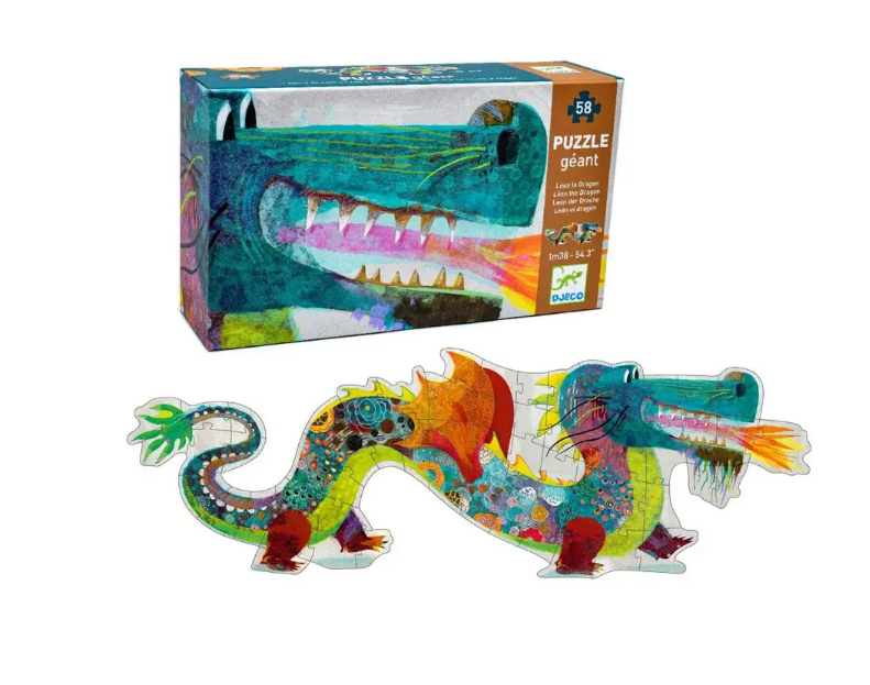 Um puzzle gigante de 58 peças onde as crianças montam um dragão com escamas coloridas. Completo fica com 1,38 m de comprimento